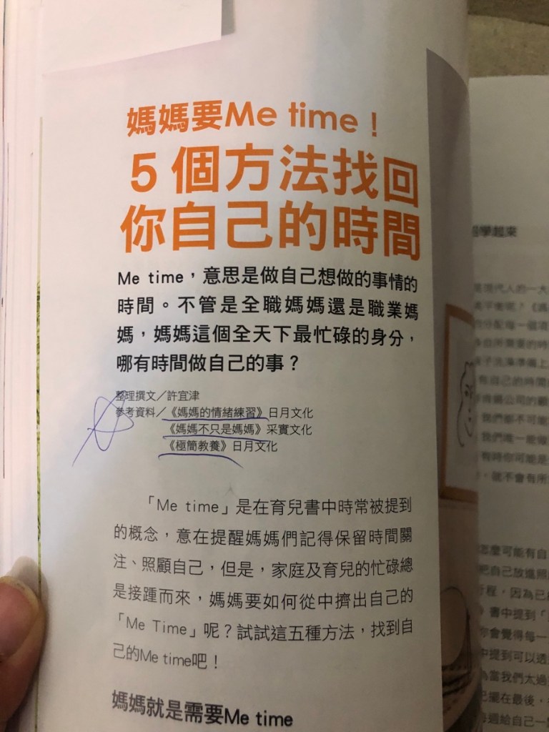 當有這個念頭出現時,就看到媽媽寶寶雜誌有推薦3本書:《媽媽的情緒練習》、《媽媽不只是媽媽》、《極簡教養》,找回Me Time時間,你看這不是又有3本書等著我去看了,常常沙潑堆滿待看的書,也是一種無形的壓力呀。