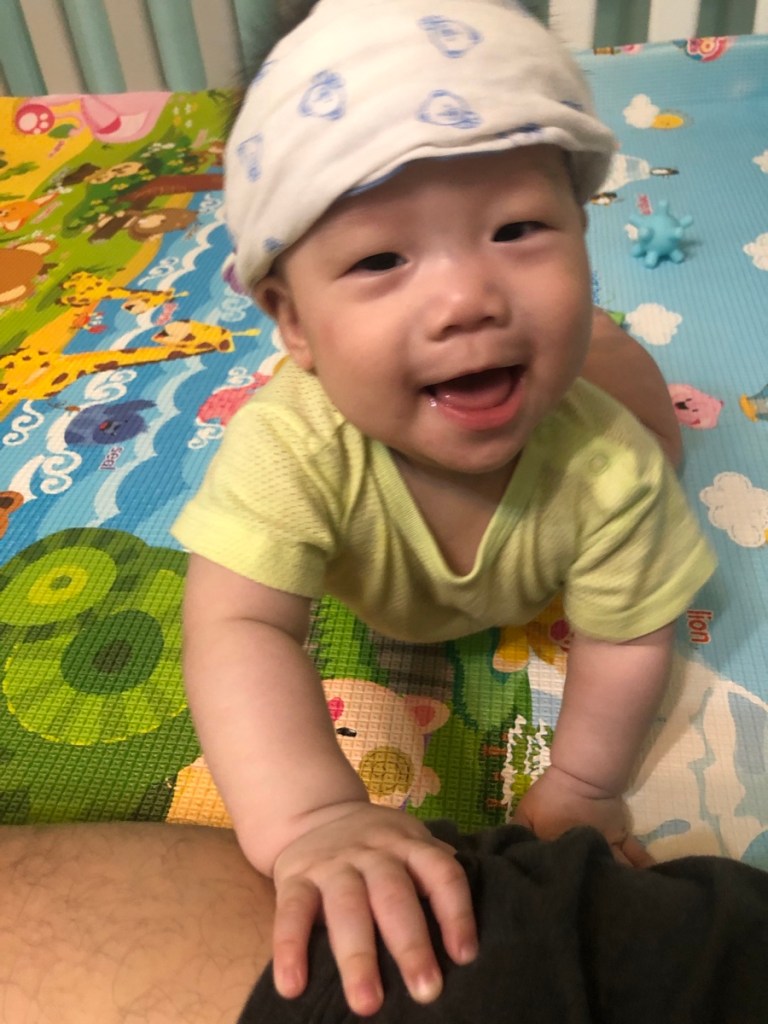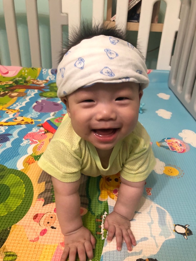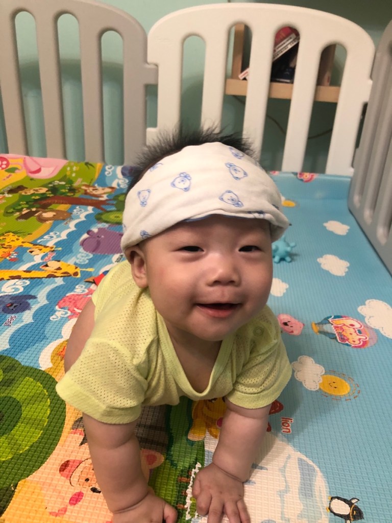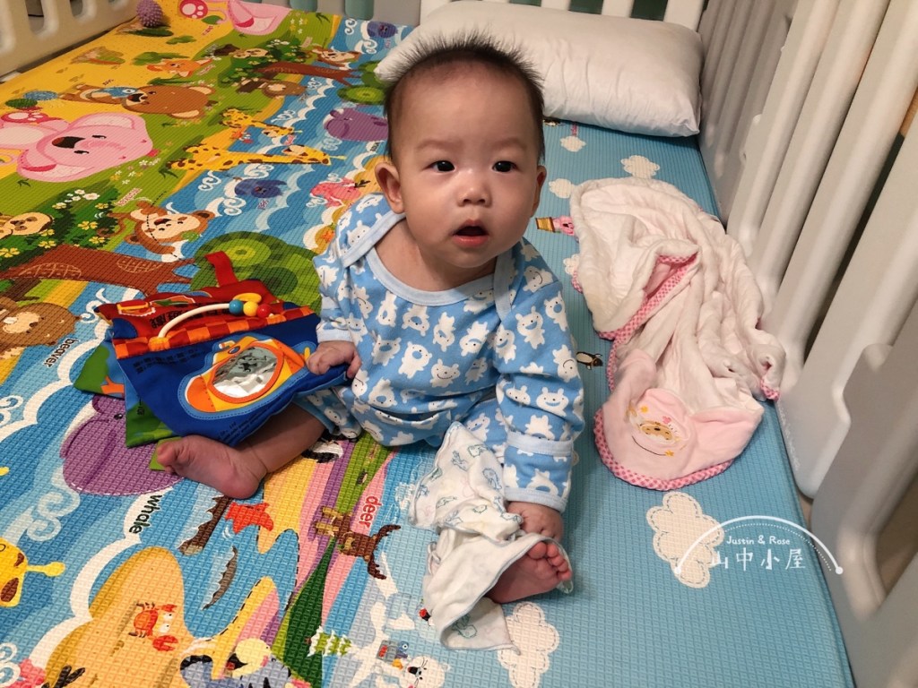 每天看到你一點一點成長,媽媽好開心,第一次看到你自己坐起來時,又穩又自然,媽媽抱住爸爸的肩頭說,他坐起來了耶,真的好棒喔。你是先會爬,正確來說是匍匐前進,再自己學會坐,一開始扶著你坐時,你會東倒西歪,怕你的脊椎還沒長好,就不會再讓你坐,有一天你就自己坐起來了。媽媽一直跟自己說,每個孩子都有自己的進度,放輕鬆,再觀察,樂觀正面,不然以想像力豐富的媽媽來說,會先嚇死自己。