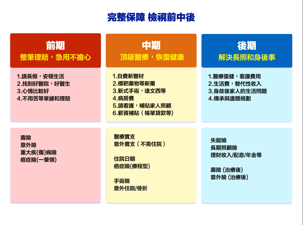 • 【前期:確診的底氣】 — 重大傷病/癌症一次金(應付立刻需要的現金)。